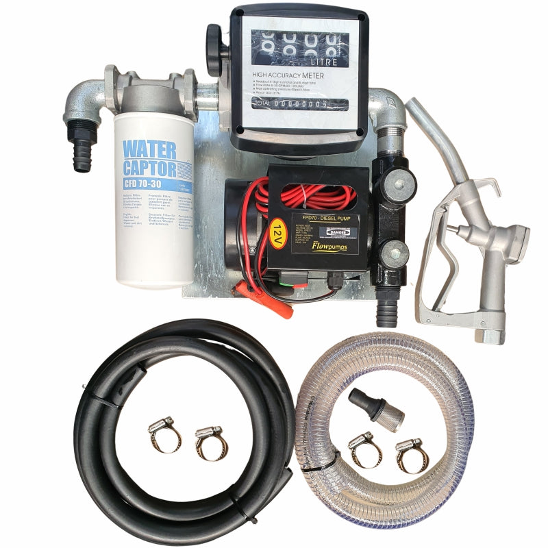 70lt - 12v Diesel pump kit with water absorbent filter - Fully assembled on wall-mount plate